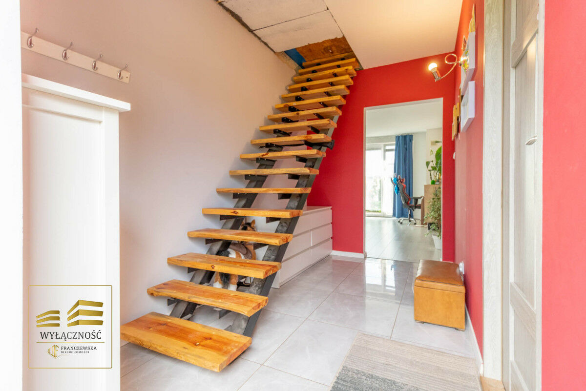 Parter wykończony, na podłogach gres i panele, schody wewnętrzne drewniane, stała zabudowa i sprzęt agd w cenie nieruchomości.