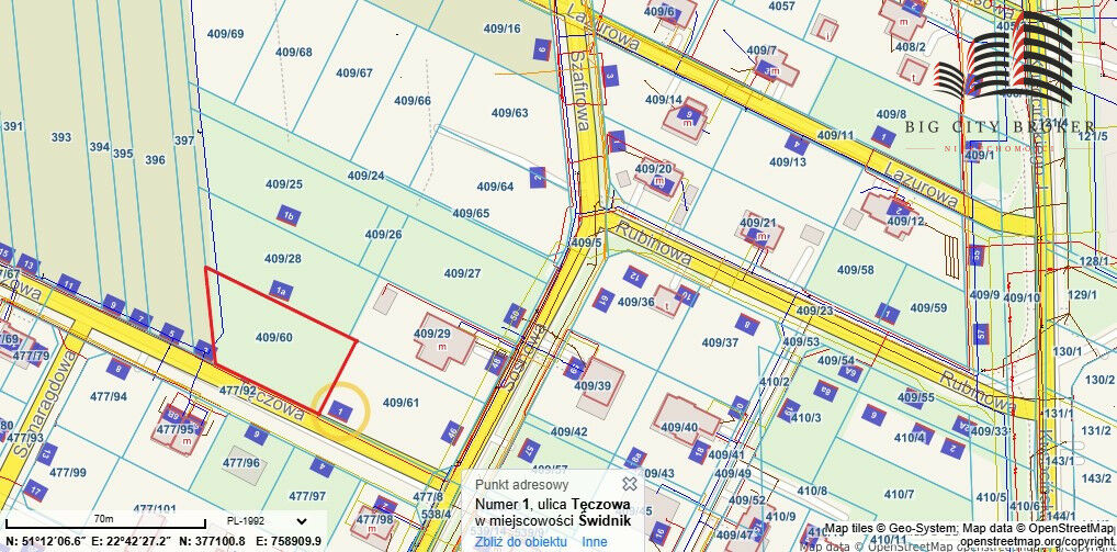Opis nieruchomości:Sprzedam działkę budowlaną położoną przy ul. Tęczowej w Świdniku. Bardzo dogodna lokalizacja dla osób lubiących spokój, a jednocześnie ceniących sobie bliskość niezbędnej infrastruktury takiej jak szkoły, markety, ścieżki rowerowe czy galeria handlowa.