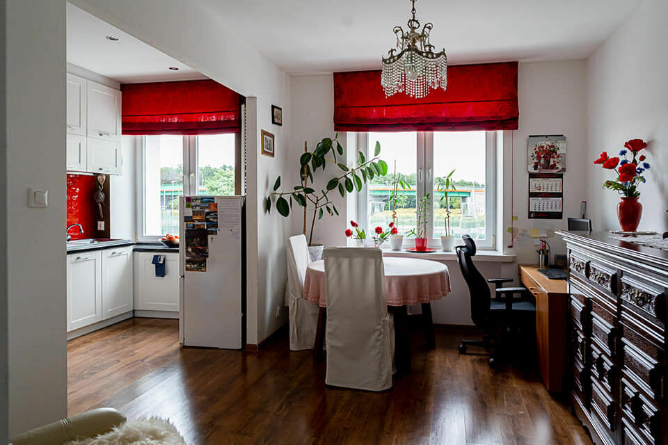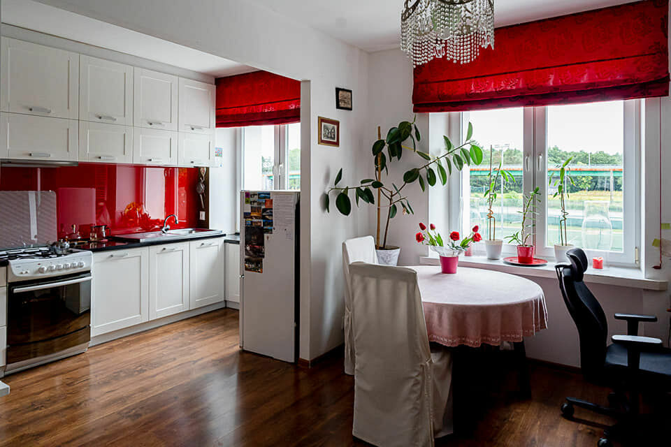 Sercem mieszkania jest jasna, otwarta przestrzeń, w której biel zabudowy kuchennej kontrastuje z energetyczną czerwienią dekoracji. Duże okna z widokiem na zieleń zapewniają doskonałe doświetlenie wnętrza, a przemyślany układ pozwala na wygodne połączenie strefy wypoczynkowej, jadalnianej i miejsca do pracy.