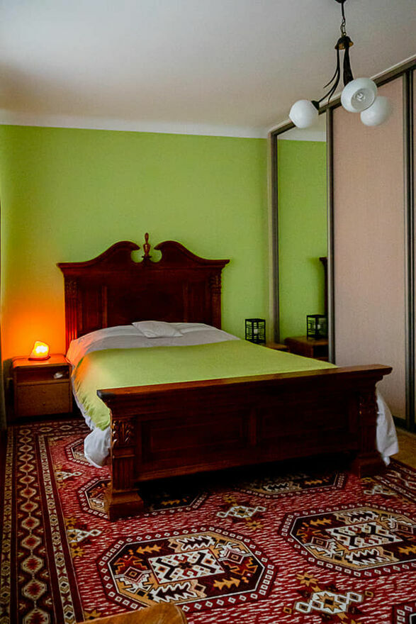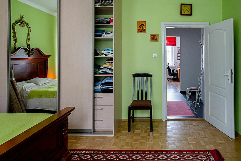 Przytulna i klimatyczna, z pojemną szafą z lustrzanymi drzwiami. Ściany w odcieniu świeżej zieleni wprowadzają atmosferę relaksu i spokoju