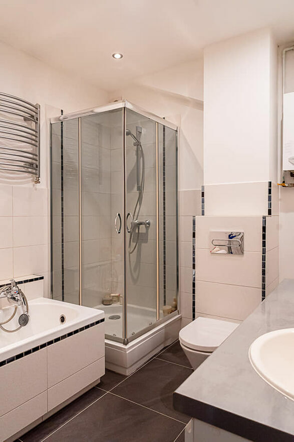 Wykończona w neutralnych barwach, wyposażona zarówno w wannę, jak i kabinę prysznicową – idealne połączenie dla miłośników szybkich poranków i długich, relaksujących kąpieli.
