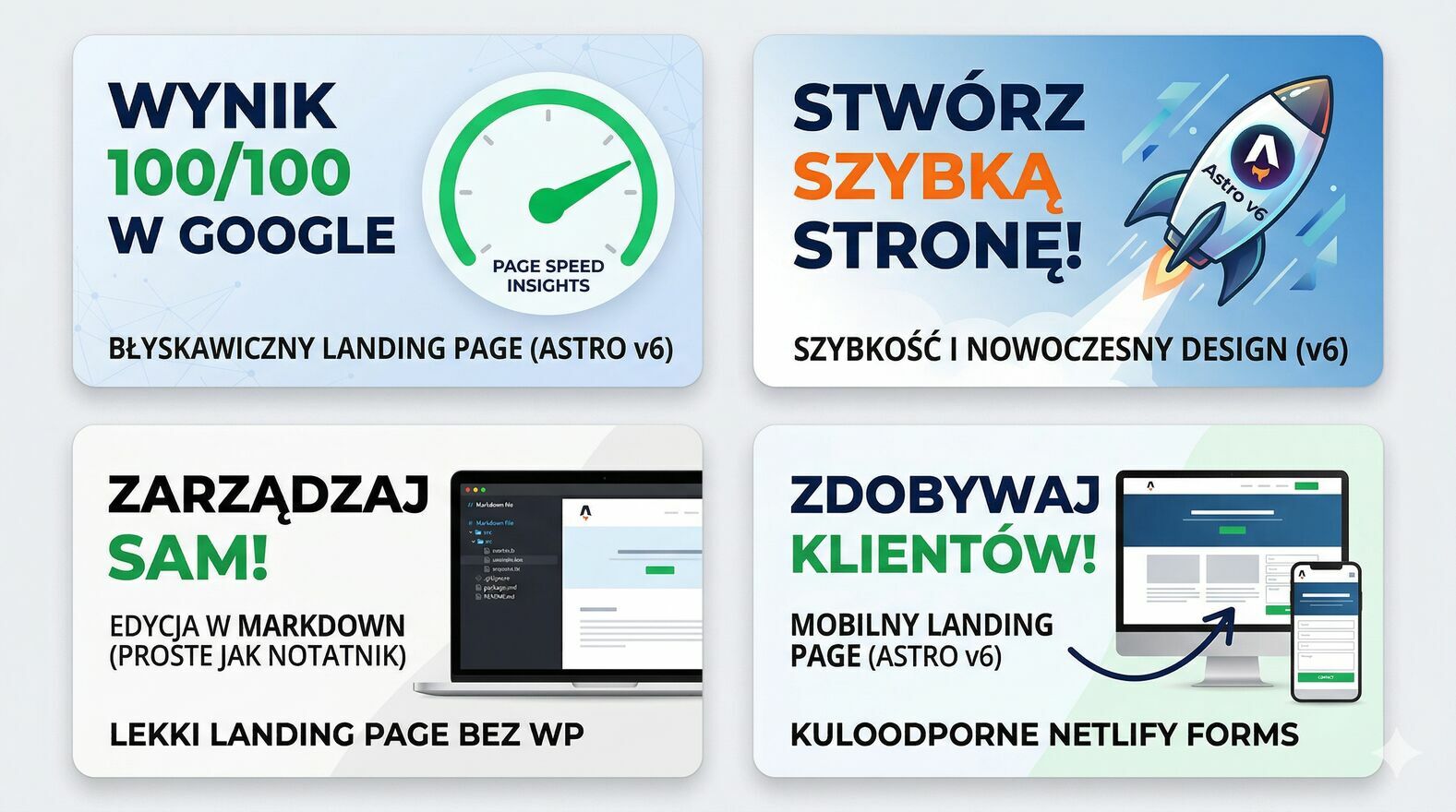 Masz dość stron, które ładują się wiecznie, a na telefonie wyglądają jak z poprzedniej dekady?Buduję Landing Page w technologii Astro v6, co oznacza, że Twoja strona nie jest ciężkim "klockiem" na WordPressie, tylko błyskawiczną i lekką witryną.